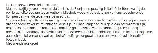 Op 2 maart is aangifte gedaan door een zakelijk rekeninghouder bij de Florijn, die het beu was om nog langer op zijn euro’s te moeten wachten als tegenwaarde voor de op 13 februari ingeleverde florijnen.